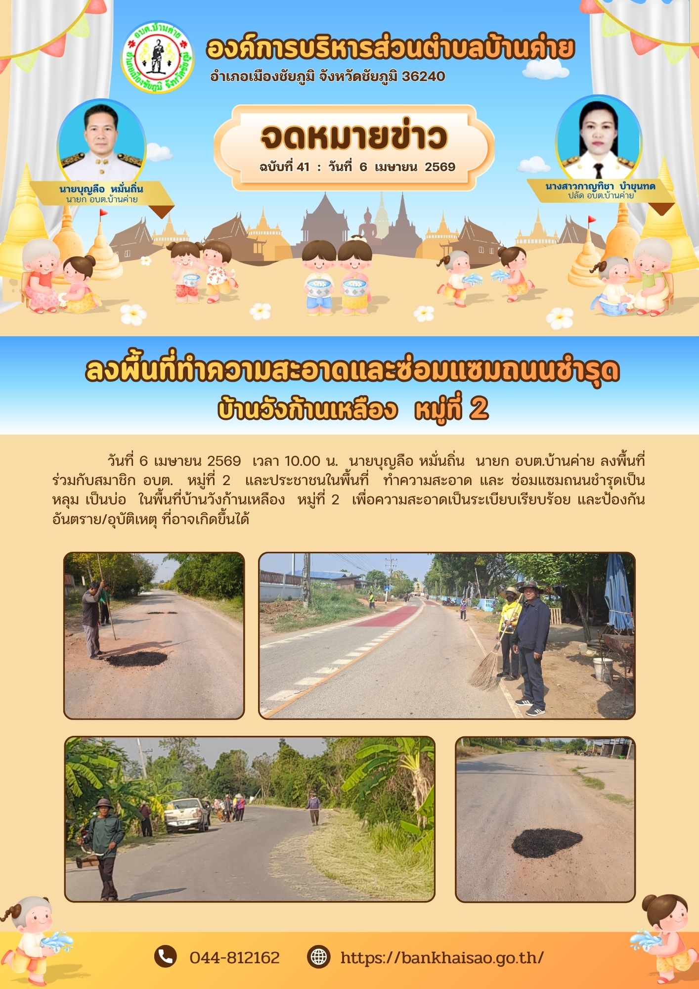 ลงพื้นที่ทำความสะอาดและซ่อมแซมถนนชำรุด บ้านวังก้านเหลือง หมู่ที่ 2...