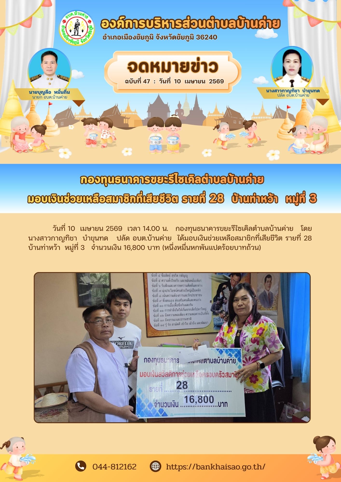 กองทุนธนาคารขยะรีไซเคิลตำบลบ้านค่ายมอบเงินช่วยเหลือสมาชิกที่เสียชีวิต รายที่ 28 บ้านท่าหว้า หมู่ที่ 3...