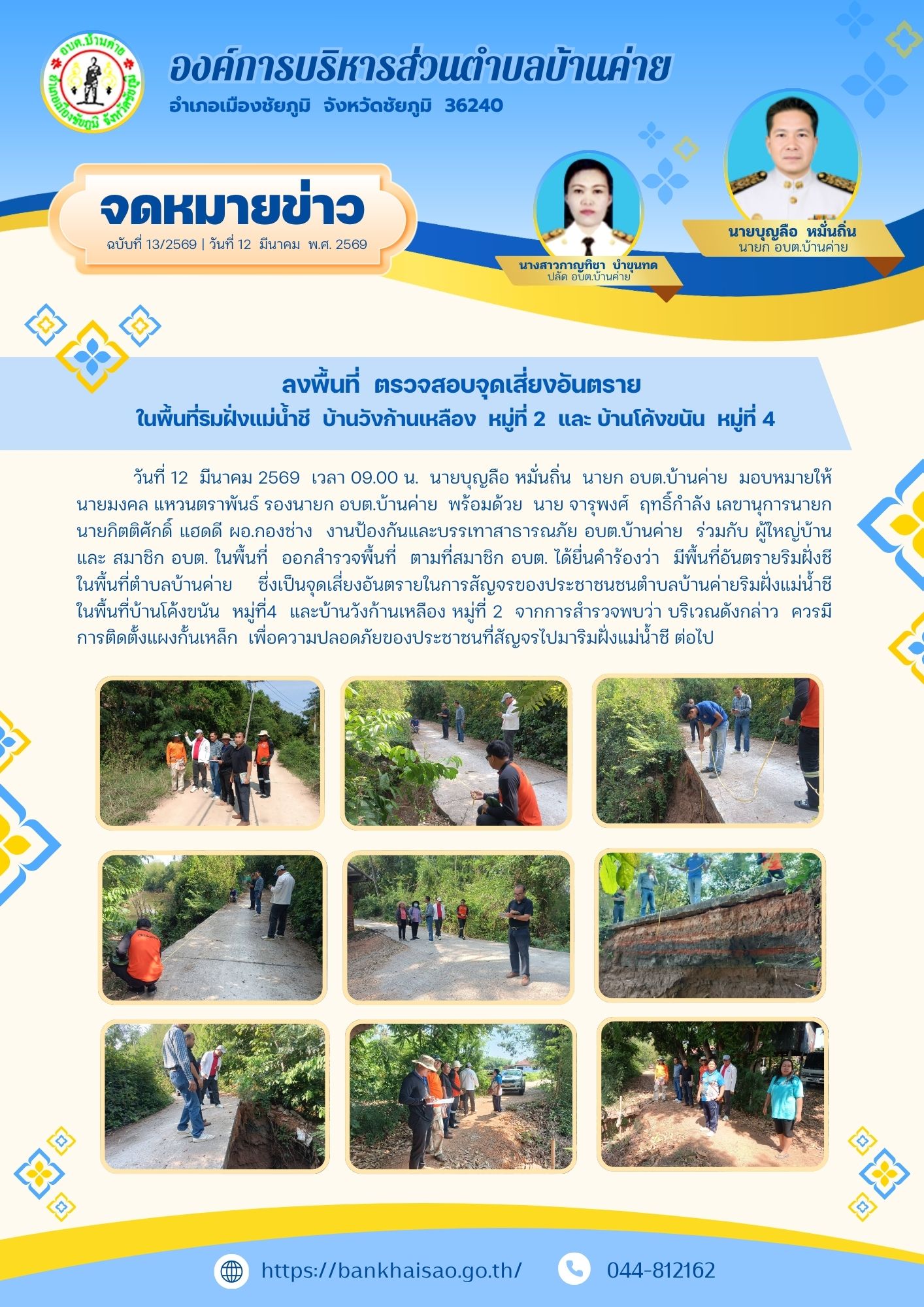 ลงพื้นที่ ตรวจสอบจุดเสี่ยงอันตรายในพื้นที่ริมฝั่งแม่น้ำชี บ้านวังก้านเหลือง หมุ๋ที่ 2 และ บ้านโค้งขนัน ห...