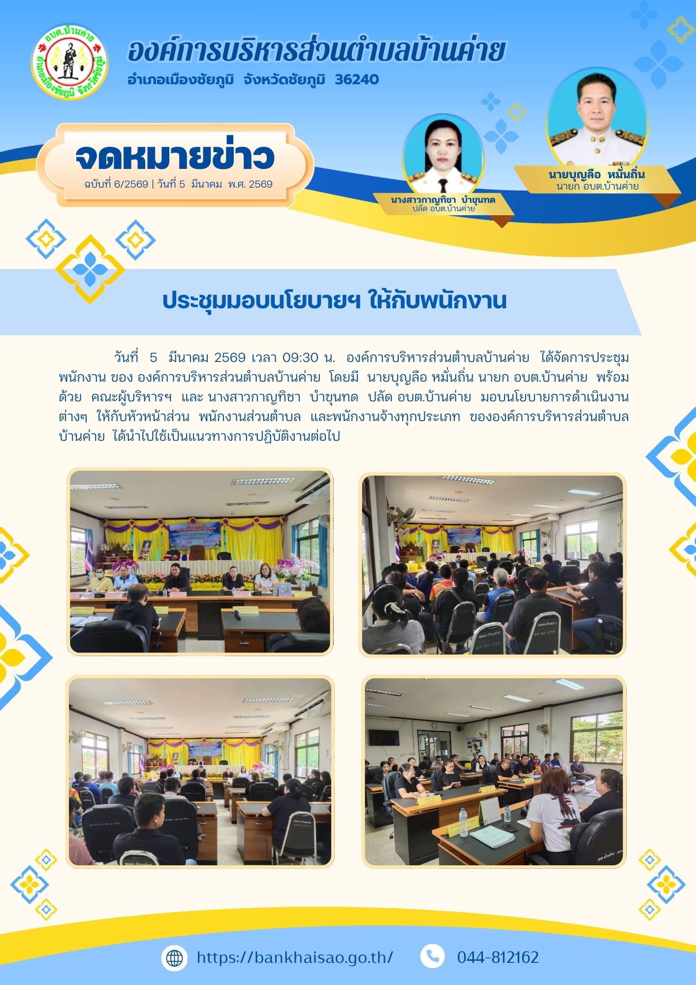 ประชุมมอบนโยบายการดำเนินงาน ให้กับพนักงานองค์การบริหารส่วนตำบลบ้านค่าย...