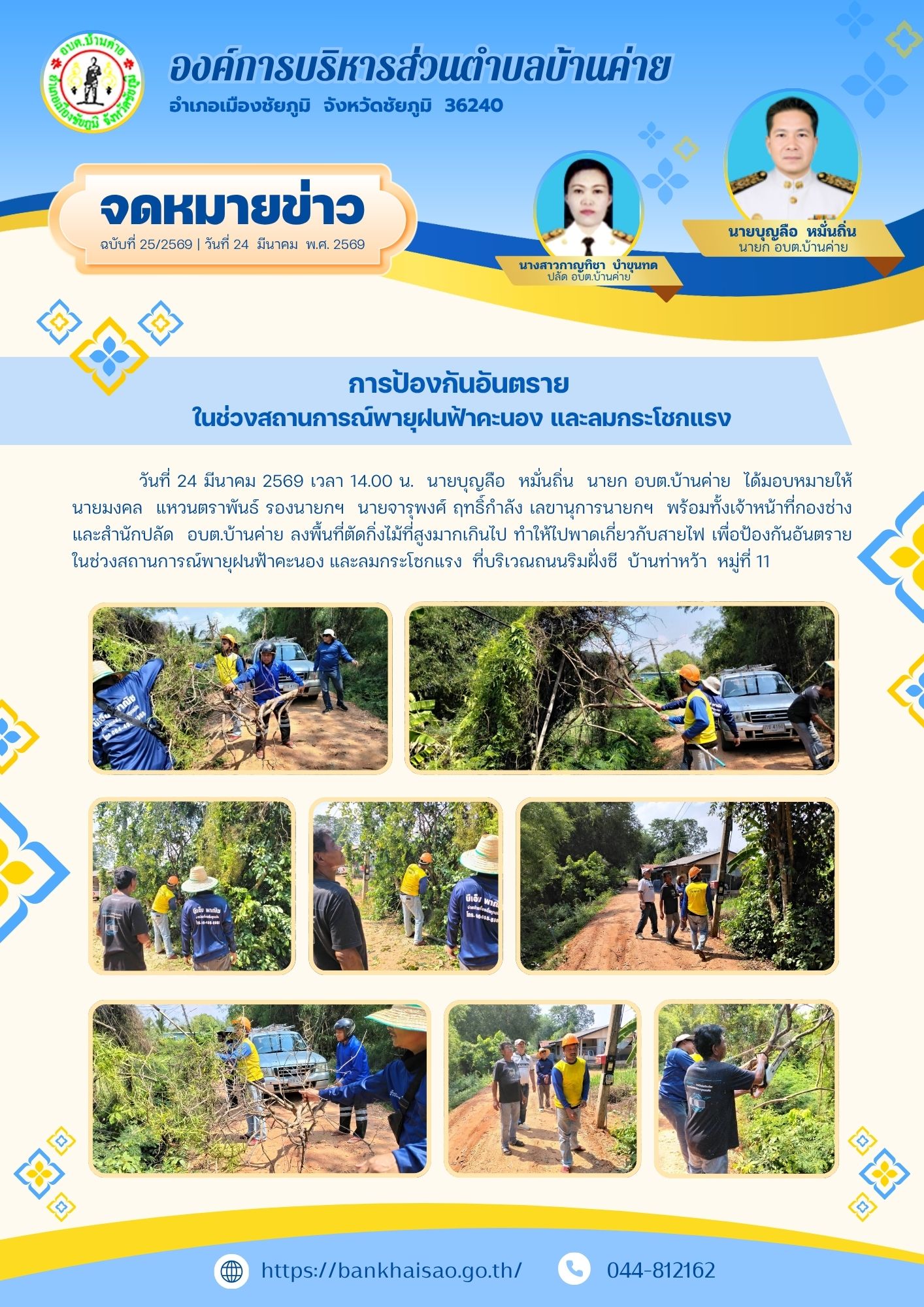 การป้องกันอันตรายในช่วงสถานการณ์พายุฝนฟ้าคะนอง และลมกระโชกแรง ที่บริเวณถนนริมฝั่งชี บ้านท่าหว้า หมู่ที�...