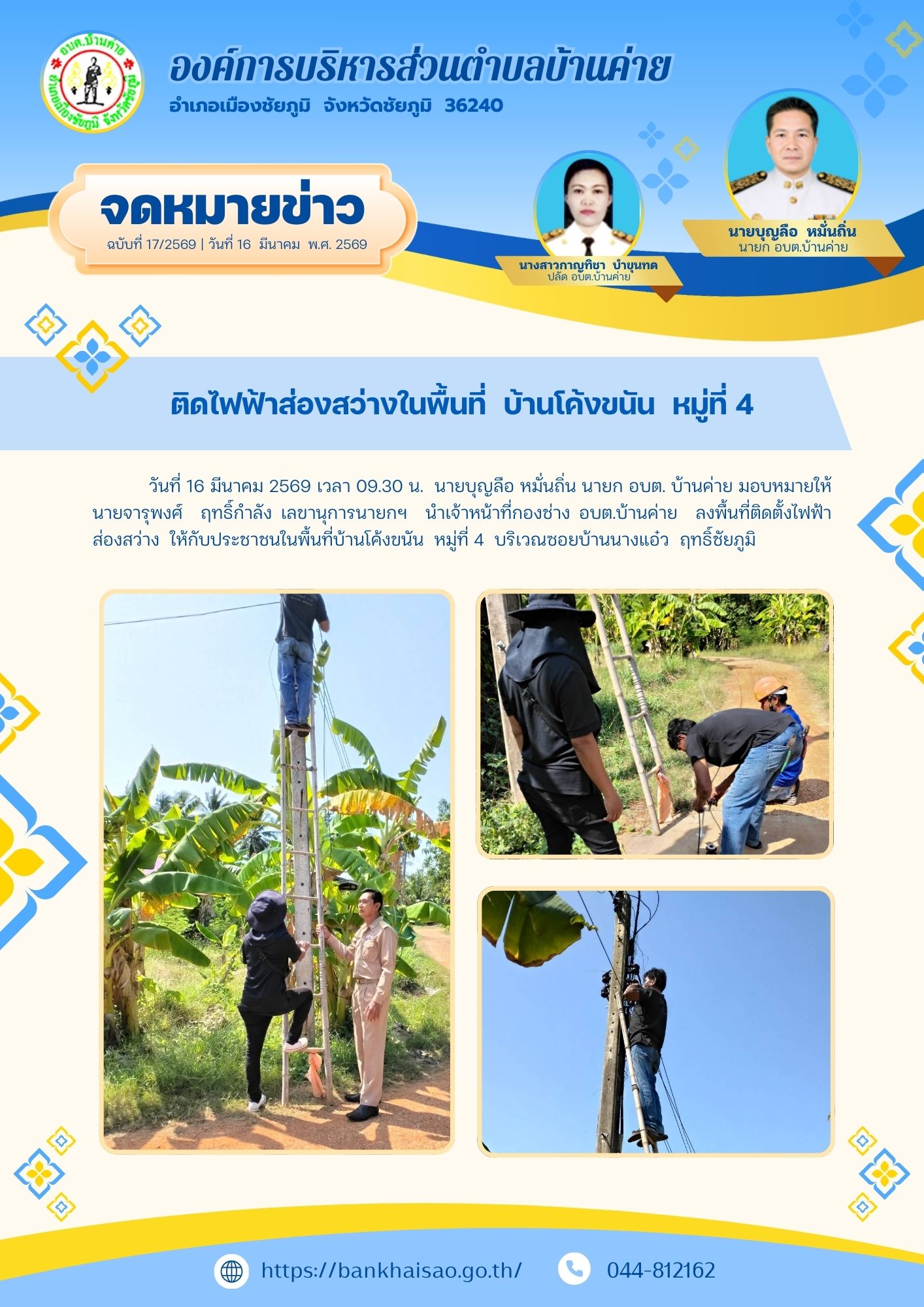 ติดตั้งไฟฟ้าส่องสว่างในพื้นที่ บ้านโค้งขนัน หมู่ที่ 4 ตำบลบ้านค่าย อำเภอเมืองชัยภูมิ จังหวัดชัยภูมิ...