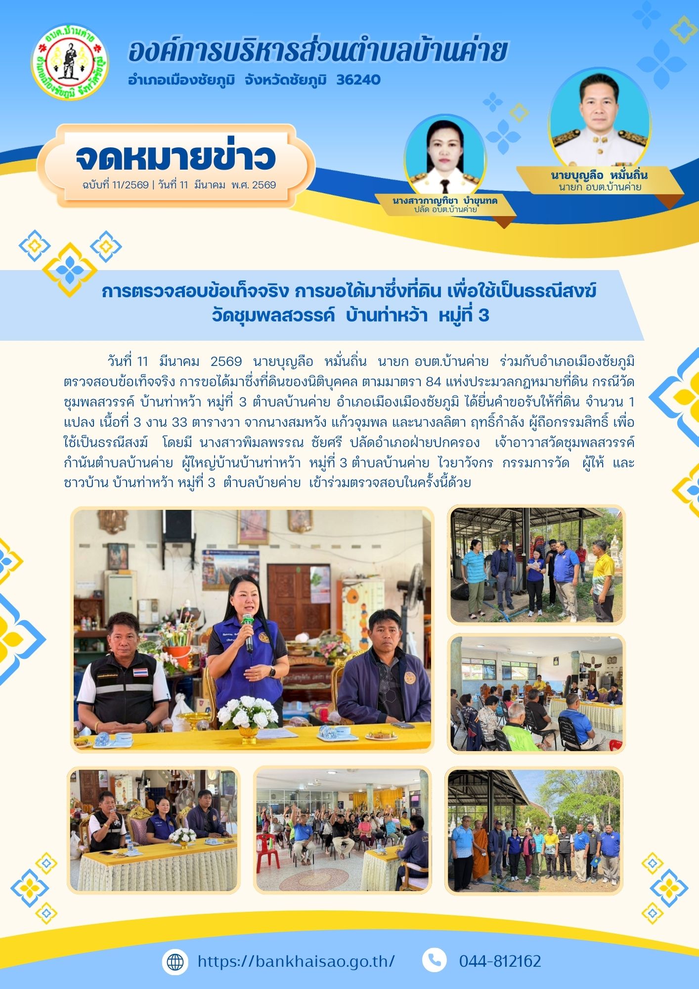 การตรวจสอบข้อเท็จจริง การขอได้มาซึ่งที่ดิน เพื่อใช้เป็นกรณีสงฆ์วัดชุมพลสวรรค์ บ้านท่าหว้า หมู่ที่ 3...