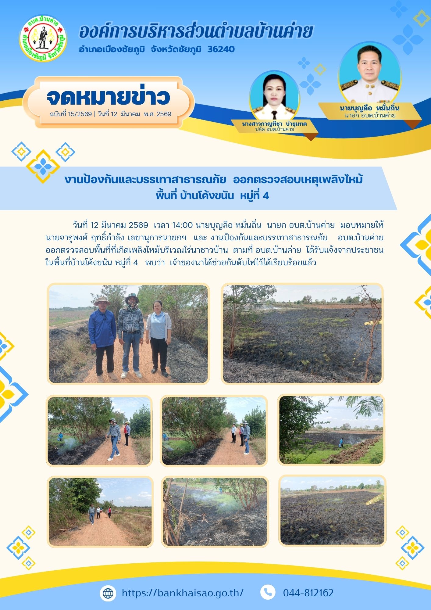 งานป้องกันและบรรเทาสาธารณภัย ออกตรวจสอบเหตุเพลิงไหม้ พื้นที่ บ้านโค้งงขนัน หมู่ที่ 4 ตำบลบ้านค่าย อำเภอเ�...