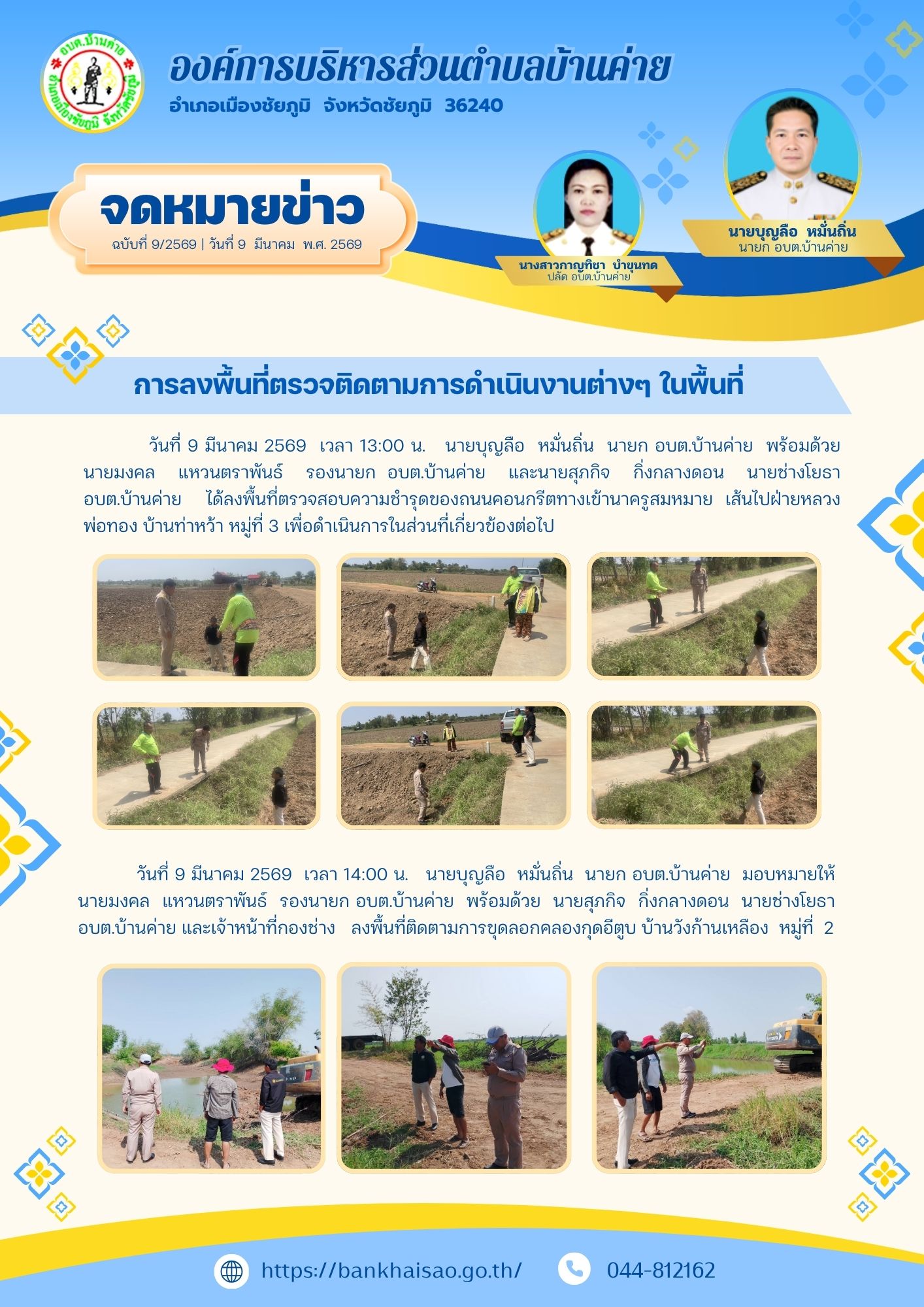การลงพื้นที่ตรวจติดตามการดำเนินงานต่างๆในพื้นที่ รับผิดชอบขององค์การบริหารส่วนตำบลบ้านค่าย...
